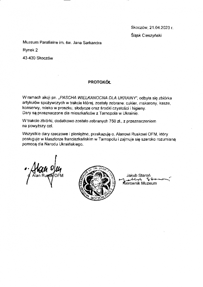 PROTOKÓŁ Z AKCJI PASCHA WIELKANOCNA DLA UKRAINY
